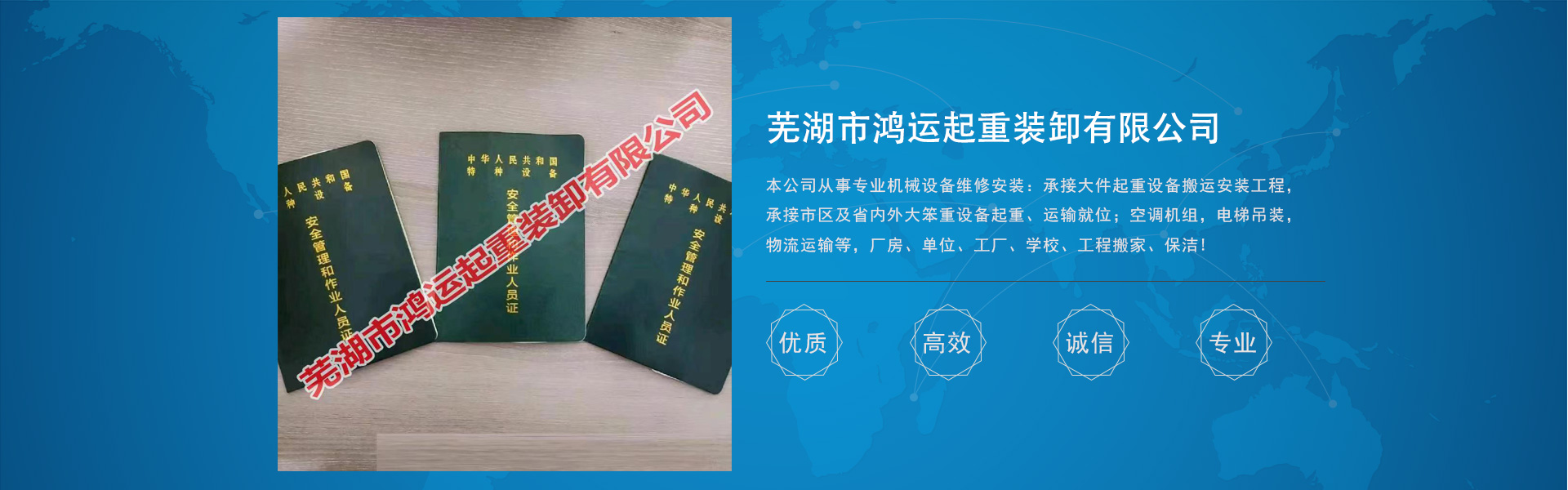 湖市鴻運(yùn)起重裝卸有限公司從事專(zhuān)業(yè)機(jī)械設(shè)備維修安裝:承接大件起重設(shè)備搬運(yùn)安裝工程。吊裝移位、大型機(jī)床、注塑機(jī)、冷水機(jī)組、發(fā)電機(jī)、醫(yī)療設(shè)備、印刷機(jī)、空調(diào)機(jī)組、鍋爐等安裝調(diào)試。油壓機(jī)、離心機(jī)組。橋梁架設(shè)、機(jī)場(chǎng)、港口、鐵路、機(jī)械設(shè)備搬等。承接市區(qū)及省內(nèi)外大笨重設(shè)備起重、運(yùn)輸就位??照{(diào)機(jī)組,電梯吊裝,物流運(yùn)輸?shù)?,廠(chǎng)房、單位、工廠(chǎng)、學(xué)校、工程搬家、保潔。